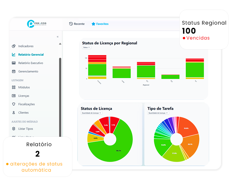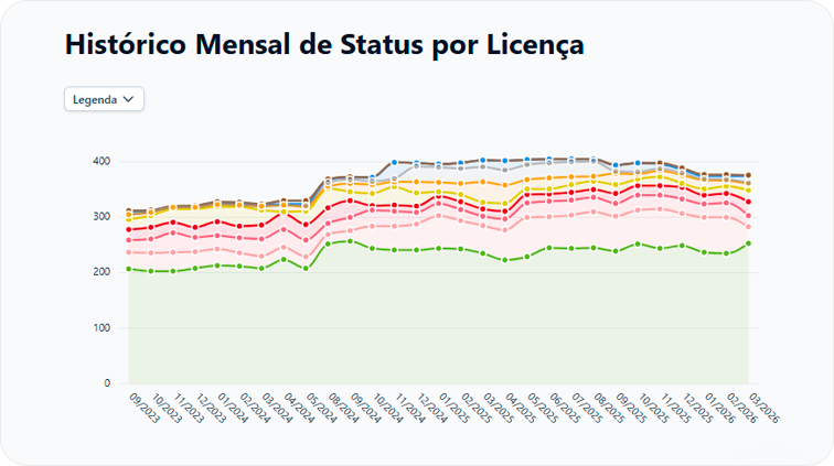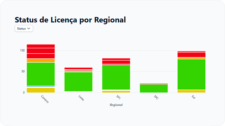 Visualize em tempo real o status de conformidade, vencimentos e performance